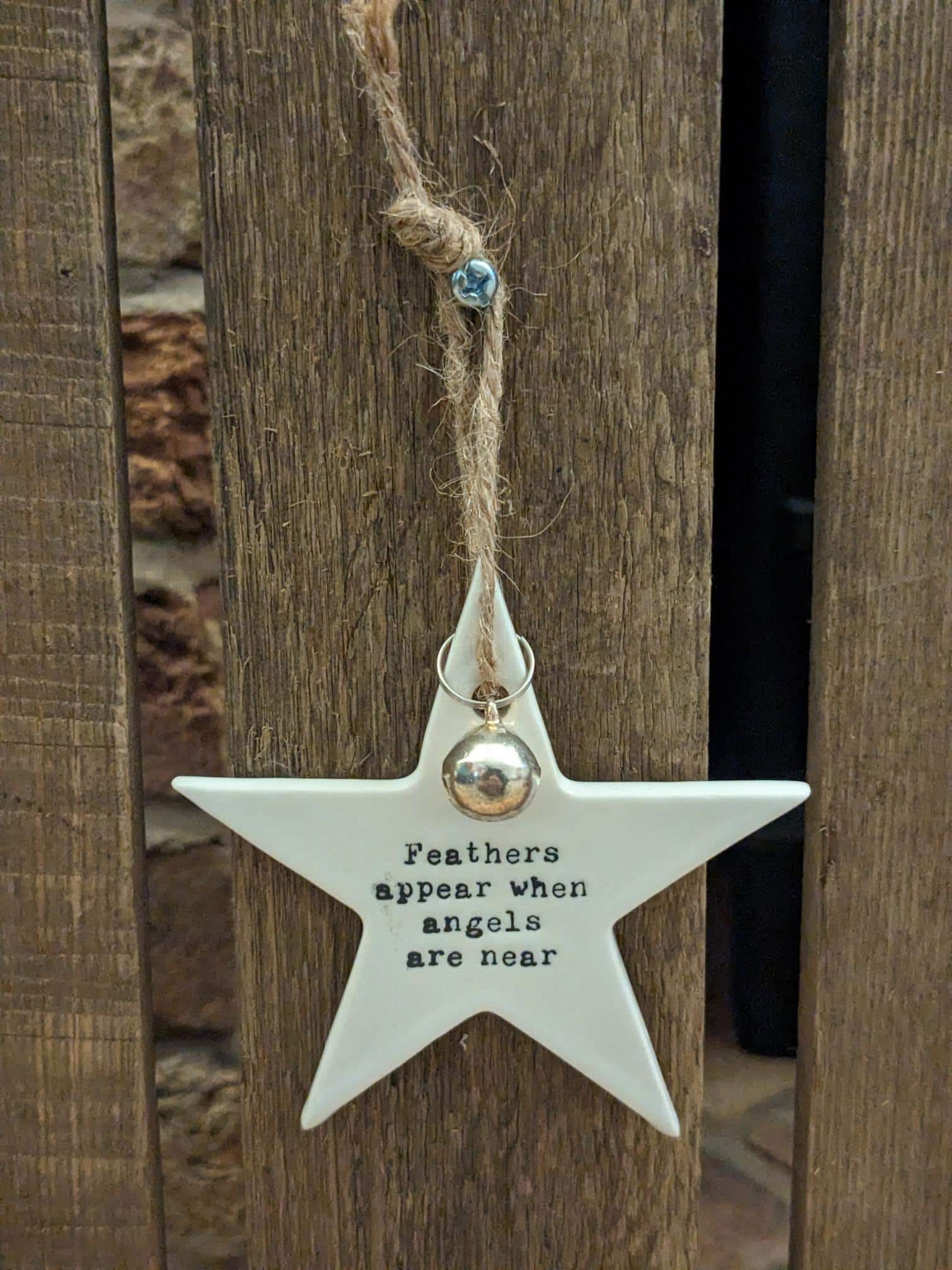 These beautiful feathers appear hanging star decoration comes with a sisal string loop and a beautiful little bell. It’s a beautiful remeberance gift.